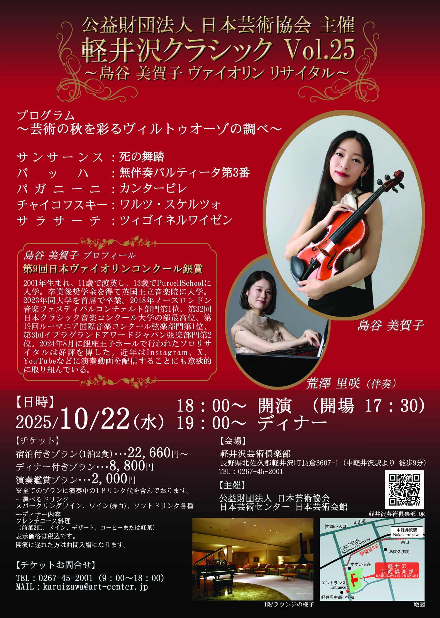 2025年10月22日(水)18:00より軽井沢芸術倶楽部に於いて、『軽井沢クラシックvol.25 島谷 美賀子 ヴァイオリン リサイタル』を開催致します。当日はフレンチコース料理をお楽しみいただけるディナー付きプランや、宿泊付きプランもご用意しております。皆様のお申込みお待ちしております。