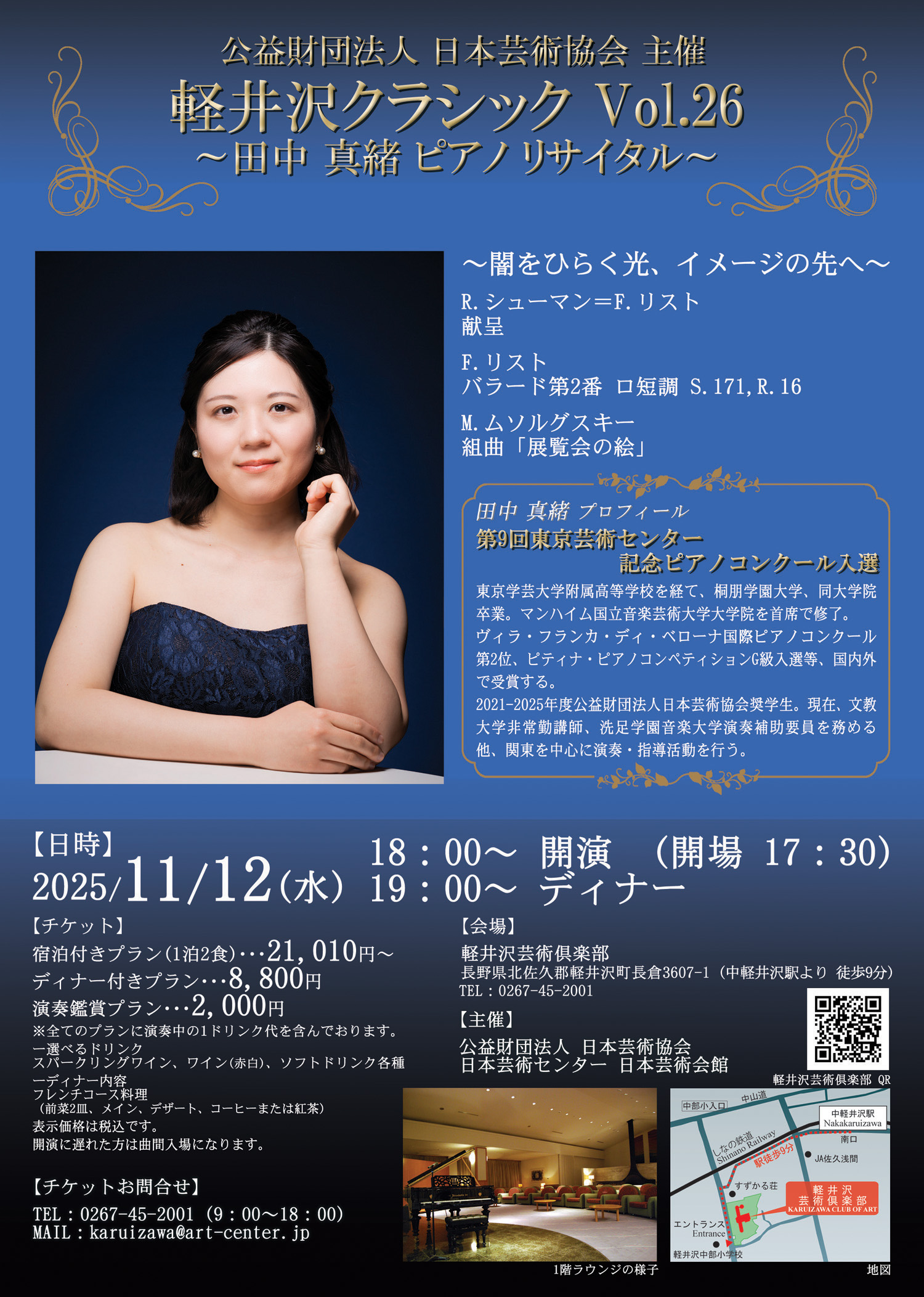 2025年11月12日(水)18:00より軽井沢芸術倶楽部に於いて、『軽井沢クラシックvol.26 田中 真緒 ピアノ リサイタル』を開催致します。当日はフレンチコース料理をお楽しみいただけるディナー付きプランや、宿泊付きプランもご用意しております。皆様のお申込みお待ちしております。