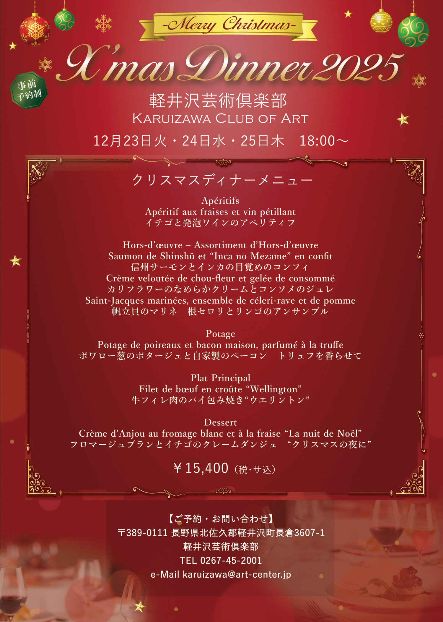 12月23日(火)24日(水)25日(木)18:00より軽井沢芸術倶楽部に於いて、『クリスマスディナー』をご提供致します。長野県の信州サーモンを使用したオードブル、牛フィレ肉のパイ包み焼きなど、クリスマスの夕べを彩る特別メニューとなっております。お得な宿泊付きプランもご用意しております。皆様のご予約をお待ちしております。