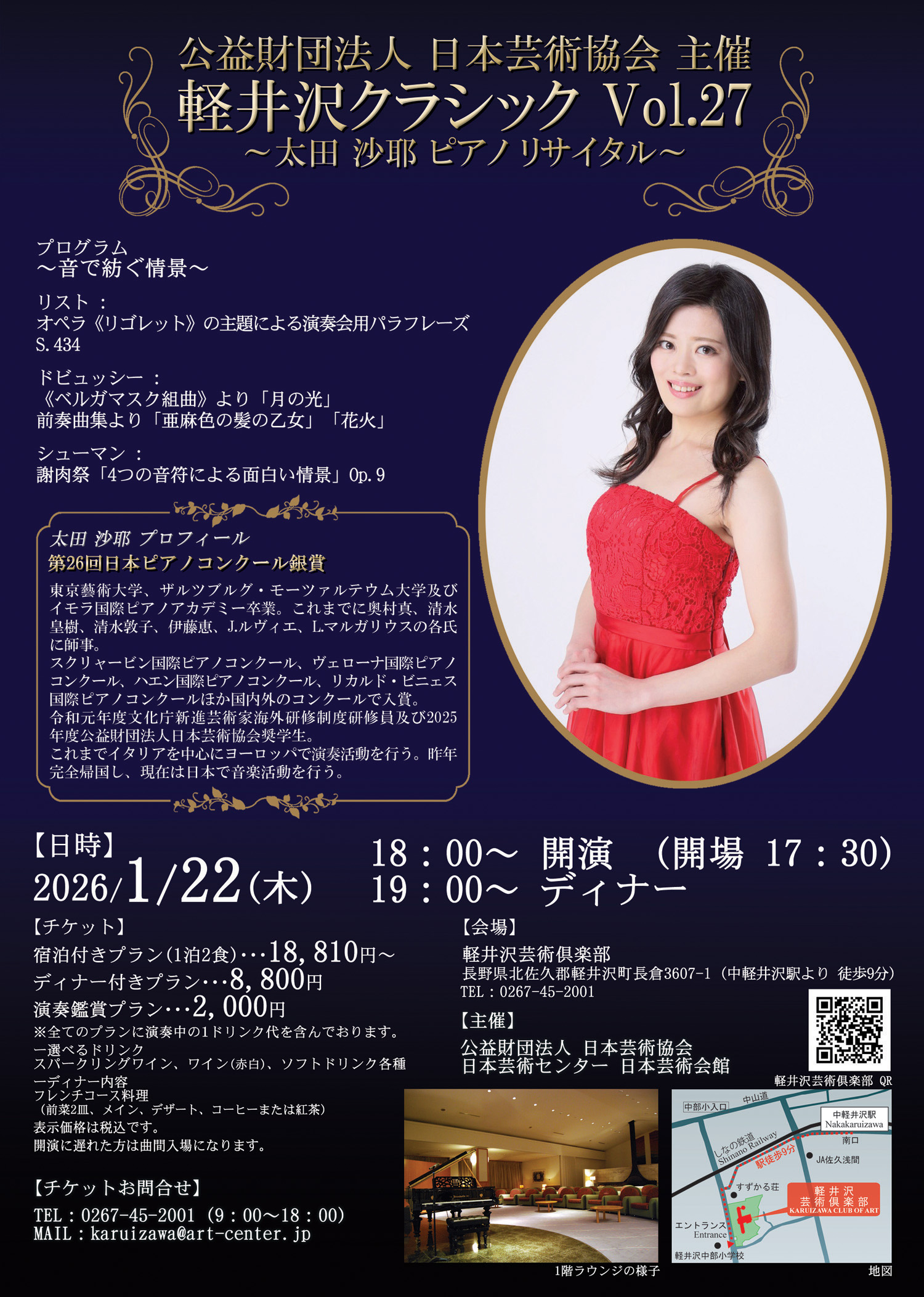 2026年1月22日(木)18:00より軽井沢芸術倶楽部に於いて、『軽井沢クラシックvol.27 太田 沙耶 ピアノ リサイタル』を開催致します。当日はフレンチコース料理をお楽しみいただけるディナー付きプランや、宿泊付きプランもご用意しております。皆様のお申込みお待ちしております。