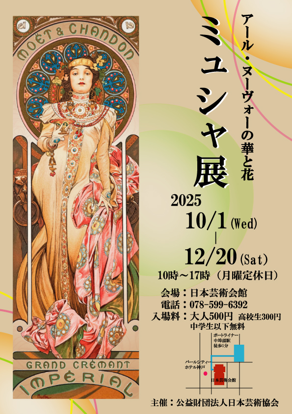 ※中学生以下無料 ※常設展もご覧いただけます 花や宝石、星などをを華麗なる曲線でデザインし、女性の姿で表現した。 19世紀末のヨーロッパに起こった芸術様式「アール・ヌーヴォ」を代表する芸術家 アルフォンス・ミュシャ。 アール・ヌーヴォとは新しい芸術を意味する言葉で、従来の様式に囚われない装飾が施されている。 当時の日本人にも影響を与え、ミュシャ風、ミュシャっぽいなどの形容詞を生み出し、現代に至っては、 漫画家やイラストレーターも「ミュシャ様式」を取り入れて表現している場合がある。 自由な曲線、花や植物のモチーフ、言わずと知れたミュシャの世界を心ゆくまでお楽しみください。 四季、四つの宝石、時の流れ、芸術等、計30点のシルクスクリーン(ミュシャ財団エンボス印有 限定部数品)を揃えております。 |